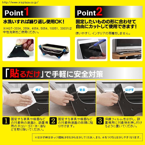 優れた粘着性により家具などの底面に貼るだけで、地震による転倒・落下を防止する粘着マットです。
