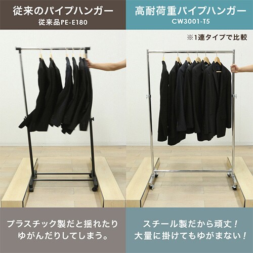 服をかけても、移動しても、グラつかない耐荷重80kgタイプのパイプハンガーです。