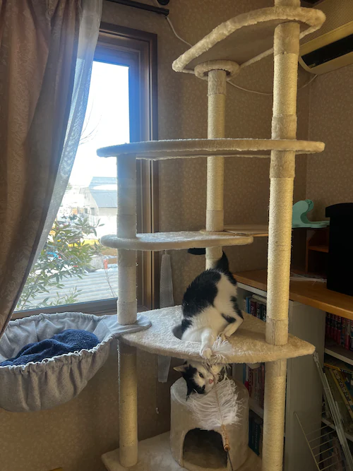- めっちゃ良いお買い物しました!値段が安かったので、あまり期待はしていなかったのですが、完成すると猫ちゃんたちも大満足!突っ張りの部分がやらかいので賃貸でも安心して取り付けできました。ただ1人での組み立てはめちゃくちゃ大変だと思います。組み立て方は簡単でしたが、上の方は結構難しかったです。猫ちゃんたちが気に入ってくれたので、購入して良かったです!