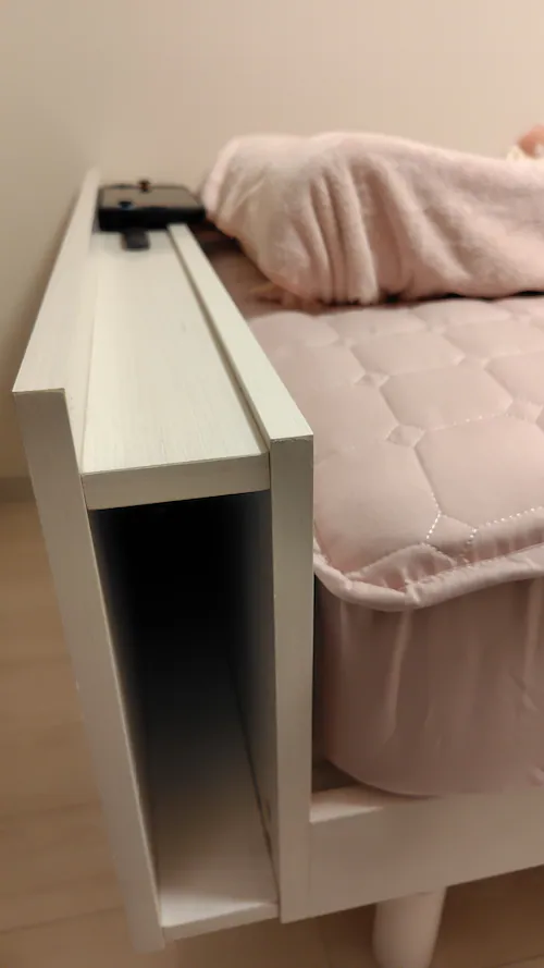 - ホワイトの色味が可愛すぎます。真っ白なのに、あたたかみのある可愛らしい白。写真では伝わりにくいですが、公式画像より届いた実物に感動しました。きしみ音も全くありません。そして棚付きが嬉しい。棚は低いかなーと思っていたのですが、届いて使ってみると低く感じることもなく、めちゃくちゃ便利なサイズと幅。スマホはすっぽり、Switch2も普通に置いとけます。【配送】1日目にマットレス、2日目に土台が届きました。逆だったら新居の何もない部屋で寝れず詰んでました笑【組み立て】男1人で簡単にやってました。女1人では重くて玄関から部屋まで持ってくことすらできませんでした。ご参考に!