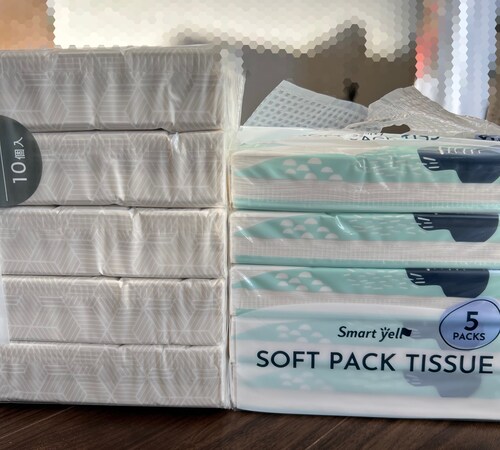 - 普通に買うティッシュより一回りサイズが小さいので布製ティッシュカバーに入れたらカバーがダブダブになってしまったので、ティッシュの空箱に入れて使ってます。