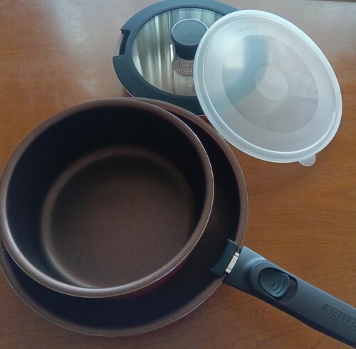 - 我が家で使用頻度の高い大きさの鍋とフライパンのセットがお安く買えて嬉しいです。蓋も二種類あって、これまた良く使うので、便利です。ハンドルの着脱も簡単で、しっかり固定されます。