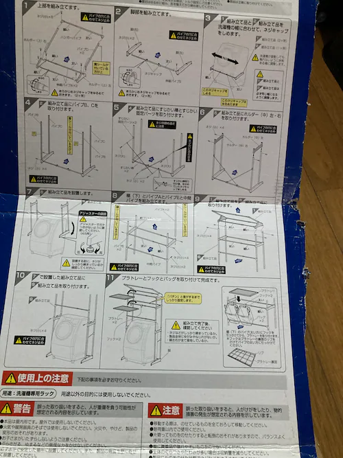 - 我が家はコの字型のスペースに洗濯機が置いてある状態で組み立てが非常に苦労しました。洗濯機が無い状態での広いスペースでの組み立てをおすすめします!