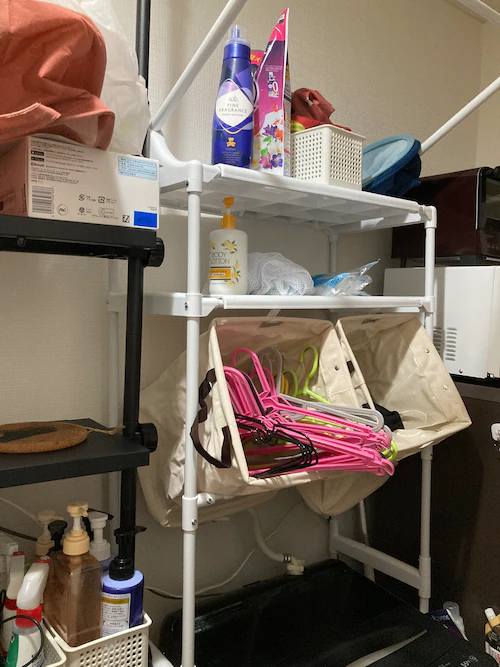 - 洗濯機の上のデッドスペースを上手く活用できて満足です。ラックの上には洗剤や柔軟剤、ランドリーバスケットを置いていますが洗濯機を回してもしっかり安定して落ちないので安心です。バーにはスプレーボトルの洗剤などをかけられるので便利です。ハンガーバーもタオルを乾かしておくのに使っています。