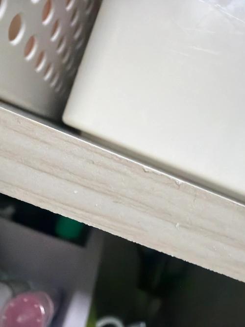 - 側板と天板をネジでとめるのですが、板の素材のせいかネジを奥まで差し込んでも固定されずグラグラするので、仕方なくボンドで固定しました。組み立ての為にもともと空いている穴が微妙にずれているせいで、天板の付け位置が場所によってずれているため少し歪んでいて、稼動棚がうまくフィットしなくて残念です。