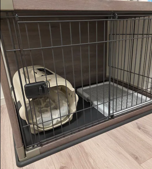- とても組み立てやすかった。ものもよいと思う。高級感はあるし、インテリアを邪魔しない。天井と背面に壁があることで、穴蔵感が生まれ、犬が落ち着くみたい。クレート飼いから、ケージ飼いに移行するのにちょうど良く、なんの混乱もなかった。犬の満足そうな表情がうれしい。