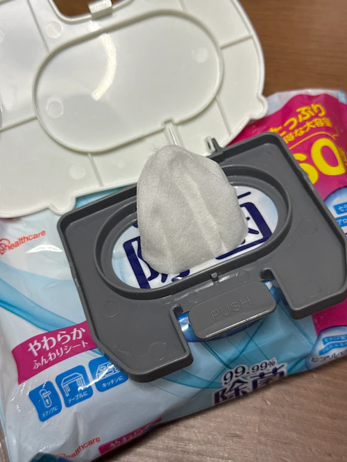 - とても厚手のものよりは薄いですが、多少のふわふわ感あるタイプなので1枚1枚取り出しやすいです。サイズもちょうど良いので、子供のテーブルを拭いたり、おもちゃの消毒をするのにも向いていて無駄なく使えます。過去には100円ショップの大判ふわふわウェッティを使ったり、薬局オリジナルのものを使っていましたが、100円ショップのものは大きくて拭きやすい分、面積を無駄にしてしまいがちなのと減りがとても早くて困っていました。薬局オリジナルは薄手で水分量がたっぷりなのは良かったんですが、拭いた時に透過してきてしまうので結局手が汚れたり、もう一枚だしたりとかなり無駄が多かったです。こちらのウェッティは程よい厚みなので拭きやすいし、無駄になりづらく、コスパもかなり良いです。ある程度頻度高く使うなら乾燥を気にしなくて良いと思うので、お尻拭き用の蓋をつけて使うと使い勝手アップ。おすすめです。