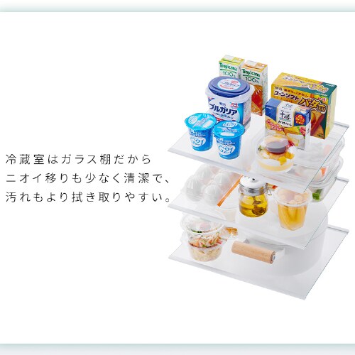 冷蔵庫はガラス棚だからニオイ移りも少なく清潔で、汚れもより拭き取りやすい。