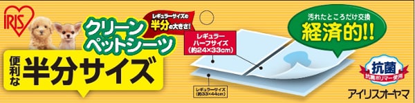 - 超小型犬の飼い主さん必携のありがたいシーツ。我が家のチワワは、チビっとずつ用を足すので、通常サイズのシーツはとても不経済。その点、このハーフサイズのシーツは非常に経済的!我が家では、このハーフサイズのシーツが八枚並べられるサイズのトレーをワンコ用トイレに使用していて、そこにこのハーフサイズを二枚ずつ重ね八面並べている。汚したシーツと汚れていないキレイなシーツをパズルのように入れ替えて使うと非常に効率的かつ経済的。一般のお店では売られていないのでいつもアイリスさんのネット通販で定期的に購入している。まさにサスティナブルなペットシーツとして欠かせない。