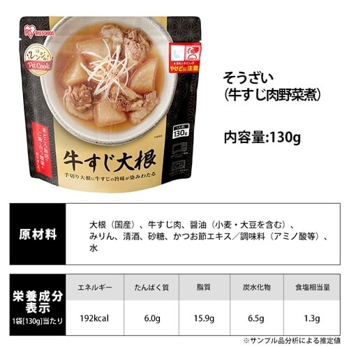 大根(国産)、牛すじ肉、醤油(小麦・大豆を含む)、みりん、清酒、砂糖、かつお節エキス/調味料(アミノ酸等)、水