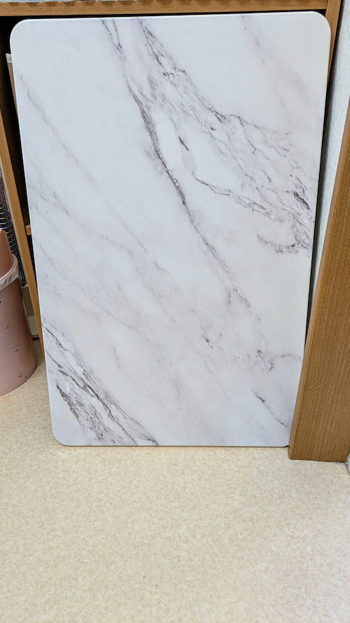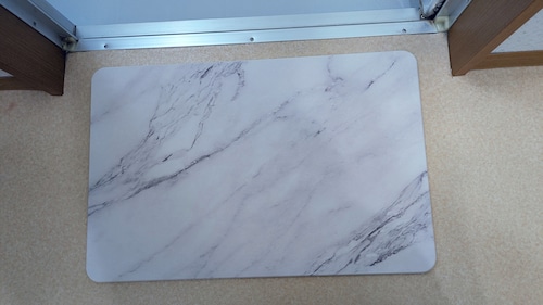 - 以前から使用の珪藻土バスマットの代りを検索していたら、アイリスさんにも取扱いがあったので試しに購入してみました。こちらは大理石調なので少し見た目も良いし床にマッチしました。水分をすぐに吸収してくれて清潔感があります。布マットの様に毎日干さずにすむので大変らくです。立てかけて置くだけでスペースも取らず便利に使用しています。