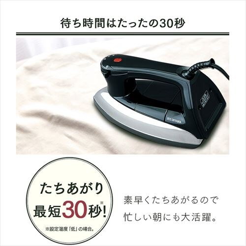 - ティファールのコード付きスチームアイロンが10年目で壊れ、新しいものもティファールで探してましたがデザインが気に入らずアイリスにしてみました。サラリーマン夫のワイシャツのアイロンがけを10年近くしていてたどり着いた理想のアイロンがこの商品です。⚫︎すぐに温まる⚫︎アイロン面が滑らか⚫︎スチームは、水タンクが不衛生だしスチーム部が溜まって出て均一ではないことがあって生地を痛めることが原因のため不要。⚫︎先はある程度尖っている方が襟ぐりをアイロンしやすい。⚫︎コードレスは温度が一定じゃないから、複数枚かける時はストレスでしかない。⚫︎本体を立てた時にコードの根本部分が回転する作りであること。全てクリア。スチームは霧吹きでかけたい部分にかけるのが結局1番なのです。こちらのシンプル機能で十分!シャツを何枚もかけると、ある程度のアイロン面が必要なので、この大きさは正解。かつかっこいい黒のデザインが秀逸。滑らかな滑りに嫌いなアイロンがけのストレスも軽減!言う事なし合格すぎます。壊れたらまたこれを買いたい。 このアイロンを考案した人は、アイロンヘビーユーザーの気持ちを分かってくれている。 ワイシャツのアイロン多めの主婦さんに超おすすめな一品です!