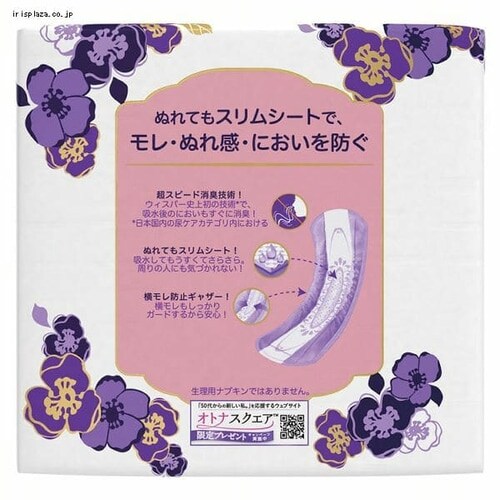 「ウィスパー うすさら安心 女性用 吸水ケア 120cc 多いときでも安心用 ナプキン型尿ケアパッド 24枚入り 27cm 大容量パック (多い量の尿モレ用)」は、ぬれてもスリムシートで、モレ・ぬれ感・においを防ぎます。