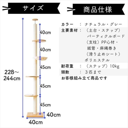- 組み立て設置簡単でした。猫大喜びで最上部まで駆け上がっています。運動も爪研ぎもできておまけに場所取らずのコンパクト設計で買ってよかったです。