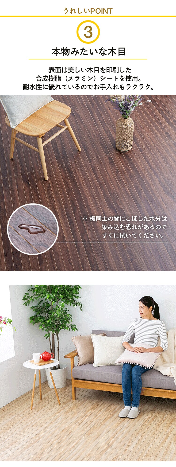 表面は本物のような木目を印刷したメラミンシートで、耐水性に優れているのでお手入れもラクラク。