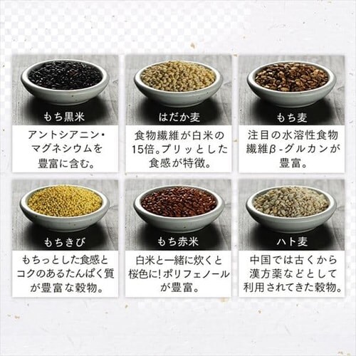 もち玄米(国産)、はだか麦、胚芽押麦、発芽玄米、もち麦、黒大豆(黒千石89%、黒豆11%)、もち黒米、もちきび、黄大豆、もち赤米、ハト麦、もちあわ、小豆、ひえ、とうもろこし