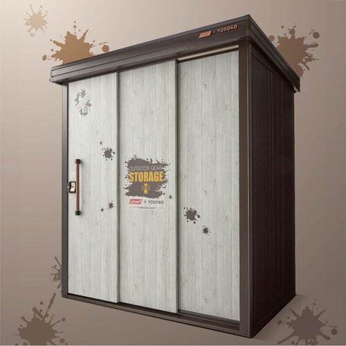 Coleman×YODOKOのコラボレーション商品である積雪対応タイプの物置です。深みのあるブラウンとブロンズ調のアクセントカラーの組み合わせが、自然な景観に溶け込みます。