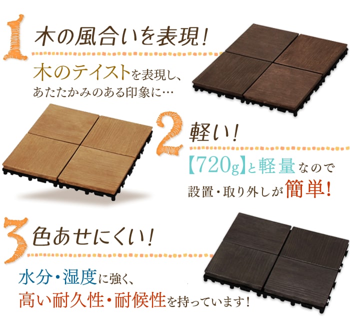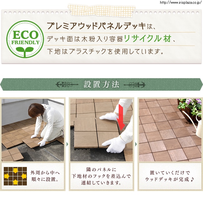 デッキ面:木紛入り容器リサイクル材、下地:PP