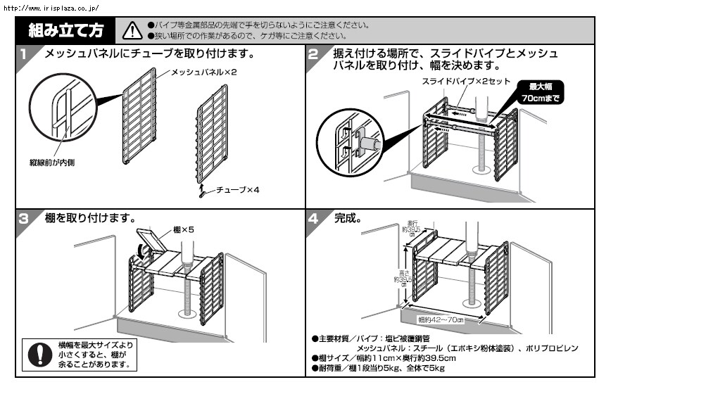 ●主要材質:パイプ:塩ビ被覆鋼管、メッシュパネル:スチール、棚:ポリプロピレン