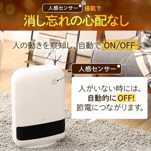 - これから寒い時期になるので、暖房器具を探していた時にセラミックファンヒーターが目に止まり、購入させていただきました。灯油を使わないとの事だったの経済的で人感センサー付なので人がいない時には電気が切れる設定だつたので、節電機能も大変助かつています。