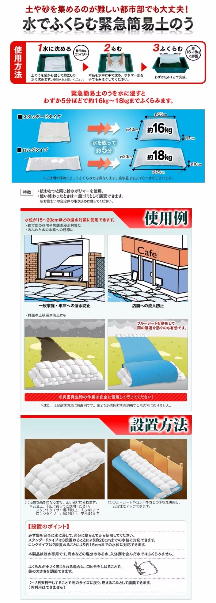 水に浸けると約5分で約16kgまでふくらみ、緊急時も対応できます。