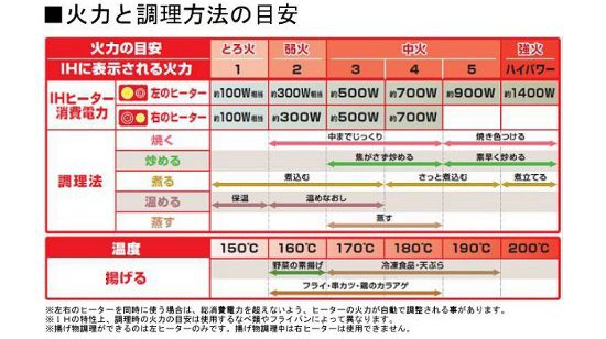 | 使えるなべ | ●鉄・鉄物 ●耐熱ホーロー ●ステンレス ●多層鋼なべ | ●〈左ヒーター〉直径12〜26cmもの ●〈右ヒーター〉直径12〜20cmもの | ●底の平らなもの●反りが3mm以下のもの |