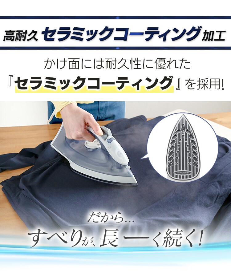 - セラミックコートでアイロン掛けがスムーズで温度も安定しているので、短時間で綺麗にアイロン掛けができました。随分前に購入し使っていた他社のコードレススチームアイロンは温度が安定せず、アイロン掛けのストレスがありました。こちらの商品はもっと早く購入すれば良かったと思う位快適です。水を入れる所も扱い易いし、立ち上がりも早く操作も簡単です。お値段以上に良い商品だと感じました。