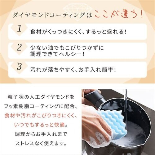 内面はダイヤモンドコーティングで食材がこびりつきにくく、料理をするっときれいに取り出せます。