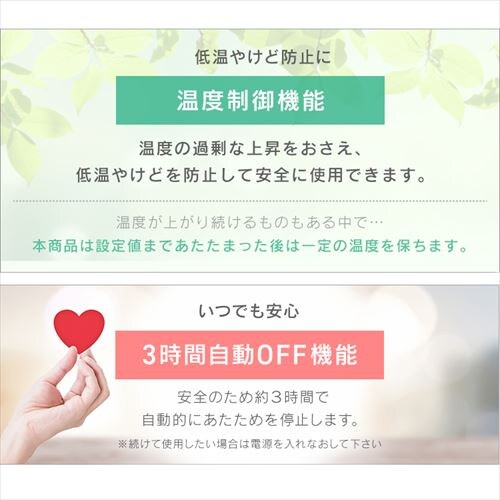 温度の過剰な上昇をおさえ、低温やけどを防止して安全に使用できます。