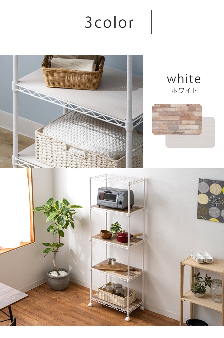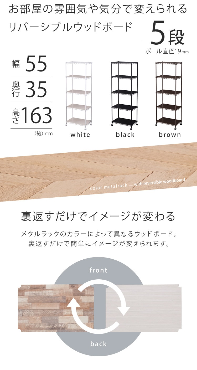 スチールラック 幅55cm 5段 カラーメタルラック ウッドボード付き CMM-55165B ホワイト