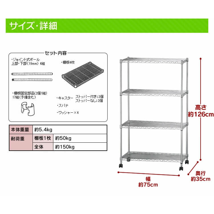 - 40代からの終活、新しく買うときは、軽量のポール19mmシリーズにしています。25mmシリーズと比べ、重さ半分と言ったら大げさですが、確実に軽くて組み立てやすいです。いつもいつもタイヤを乗せるわけではないですからね、大抵の日用品は耐荷重OKでしょう。奥行き35cmは、A4横置きにちょうどいいので、ファイルボックスを置く時は35cmを買うと決めています。奥行き46cmより部屋を広く使えていいですよ。