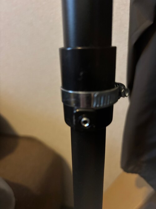 - スマートな感じで良いのですが、組立時に調整の継ぎ手部分がプラスチックな為少しでもネジを締めすぎるとパキッと縦に真っ二つに割れます。その為ホースバンドで固定しました。