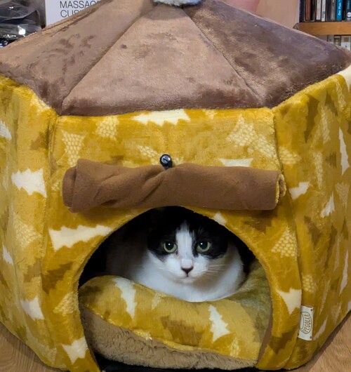 - 急に寒くなってきたので熱源が無くても暖かく過ごせる物を探して見つけました。グレーの方がインテリアに馴染みそうでしたが、セールになっていたこちらをチョイス。届いて直ぐにテントを広げたら、下のクッションを入れる間もなく我が家の姫が潜り込みました。とりあえず目の前の箱に入ってみるという感じでしょうか… ひと回りして出てきましたが気が付くとそこに収まっています。気に入ってくれたようです。