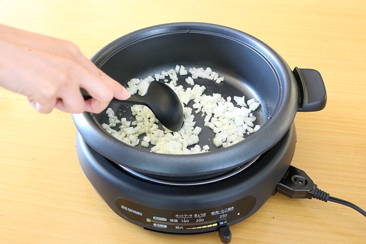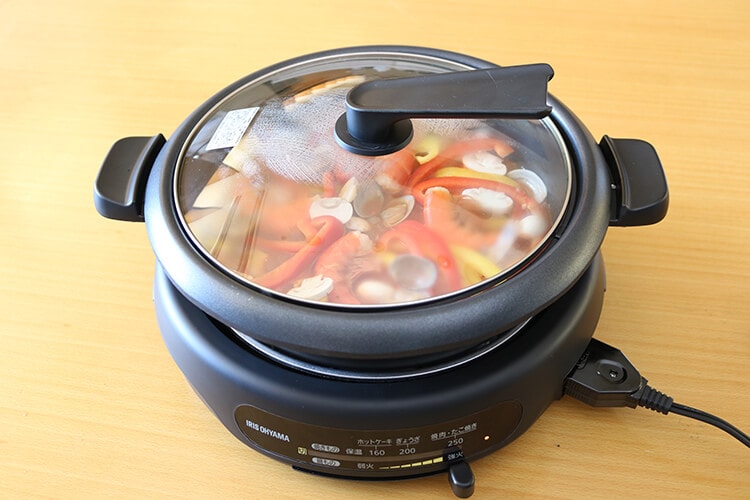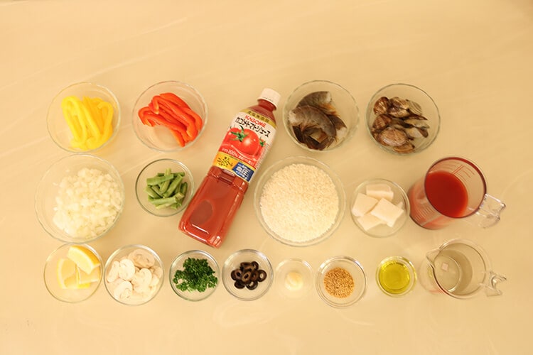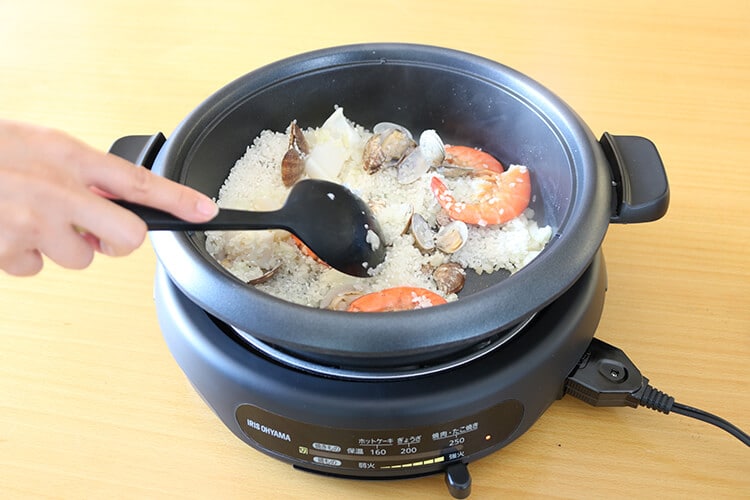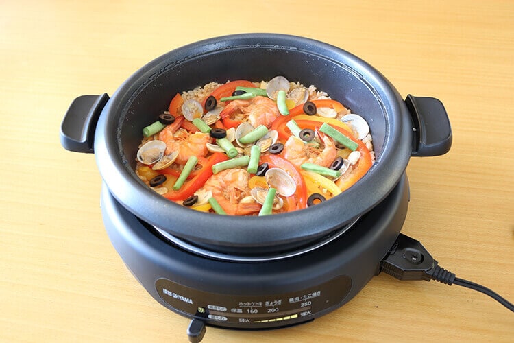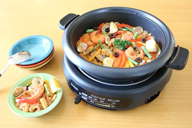 深型ホットプレートを使って家で手軽にスペイン 料理のパエリアが楽しめます。 パプリカパウダーやサフランの代わりにトマト ジュースを使用しているので、お子さまも食べやすい 味わいになります。