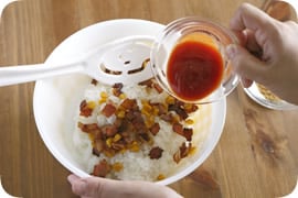 コーンベーコン、ケチャップ、コンソメ、塩こしょうを加え、しゃもじで混ぜる。