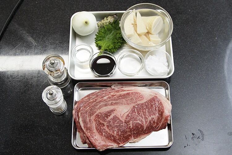 器にごはんを持って、ステーキとたけのこをのせてタレをかける。8のたまねぎと千切りの青じそを載せ、お好みでわさびを添えて完成。