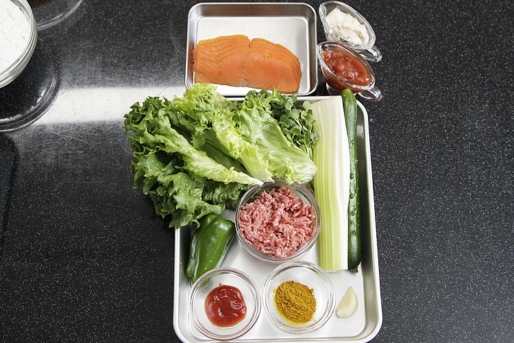 カイワレは洗って水気を切る。レタスは半分から1/4に切る。セロリとキュウリは1pの拍子切りにする。