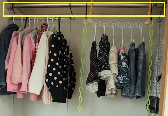 - 突っ張り棒に100均のフックとチェーンを吊り下げて子供洋服を収納しています。 チェーンの長さも変更でき、突っ張り棒の長さも変えられるので非常に使いやすいです。子供洋服なら軽量なので落ちにくいのもポイントです。空間の無駄をなくす収納方法で気に入っています。