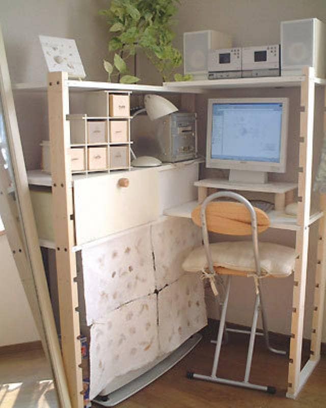 大きめのストーブの目隠しを兼ねたリビング収納スペースプラス私のパソコンスペースとして利用しています。