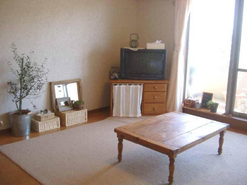 使い込まれた味のある手作りテーブルを囲んだダイニングスペースと、ナチュラルスタイルでくつろぎ感いっぱいのリビングスペースがとっても素敵なお部屋です。厳選して飾られたアンティーク小物にも注目!