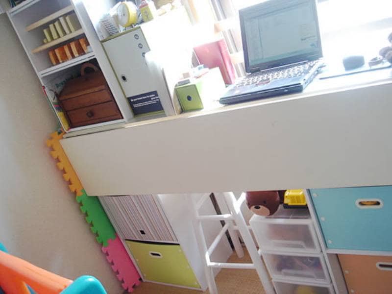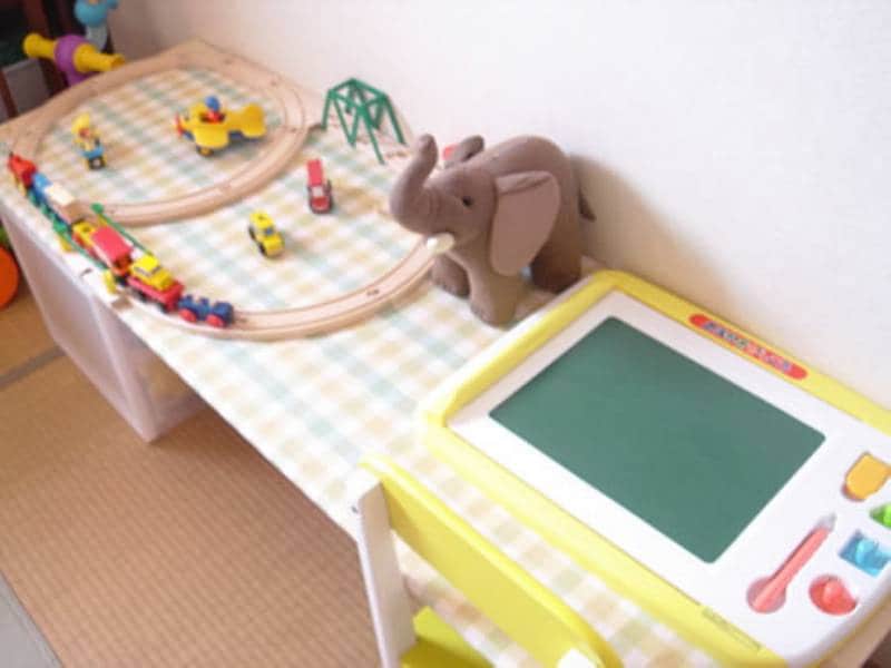和室で使用している細長いテーブルもDIYした物です。息子がお絵かきをしたり、列車を走らせたりして遊んでいます。机の下はおもちゃを収納。
