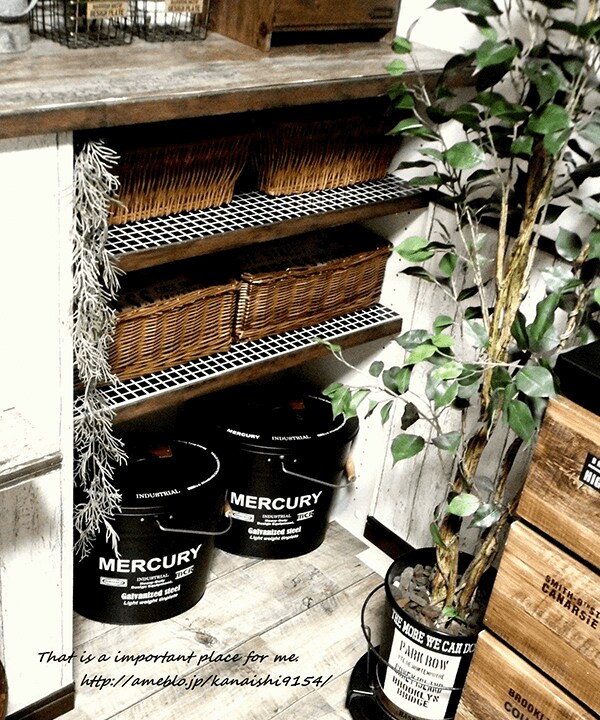 空き箱などのチープなアイテムを使って、「リメイク」と「簡単なDIY」でカフェ風テイストの「魅せる収納」にしています。
