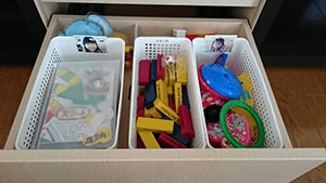 子供の顔写真のラベルを貼って、子供にもモノの位置が分かりやすく、片づけもしやすい工夫をしています。