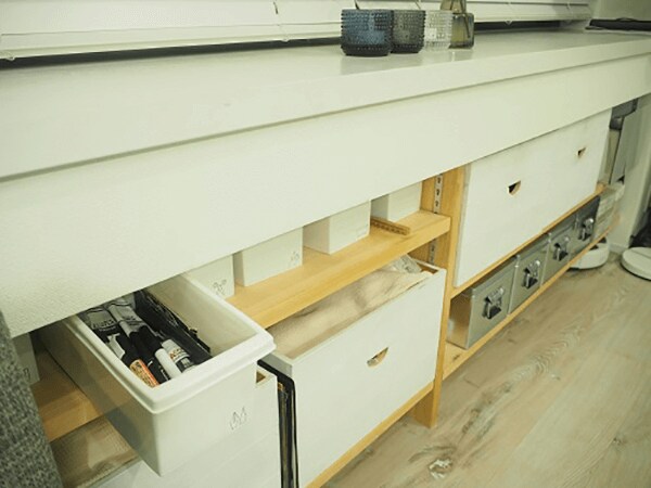 引き出し収納には、文房具や工具、ハンカチやマスクなどをカテゴリーごとに分けて収納しています。一番下の段には、子供がおもちゃや本を自分で片づけられるよう背丈にあった位置に置いています。また半透明のボックスを使って中身がわかりやすいようにしています。