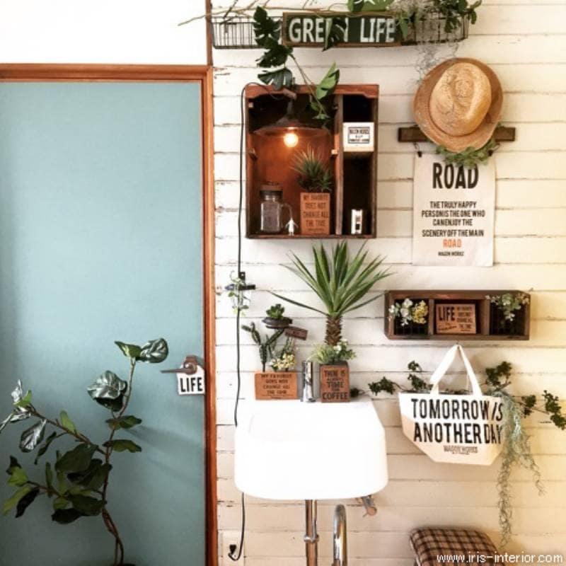 2階にある洗面スペースの白い板壁も、グリーンなどを使いながら、カッコ良く飾っています。ライトはパイ皿を使って作ったもの。爽やかな男前インテリアになったかな?