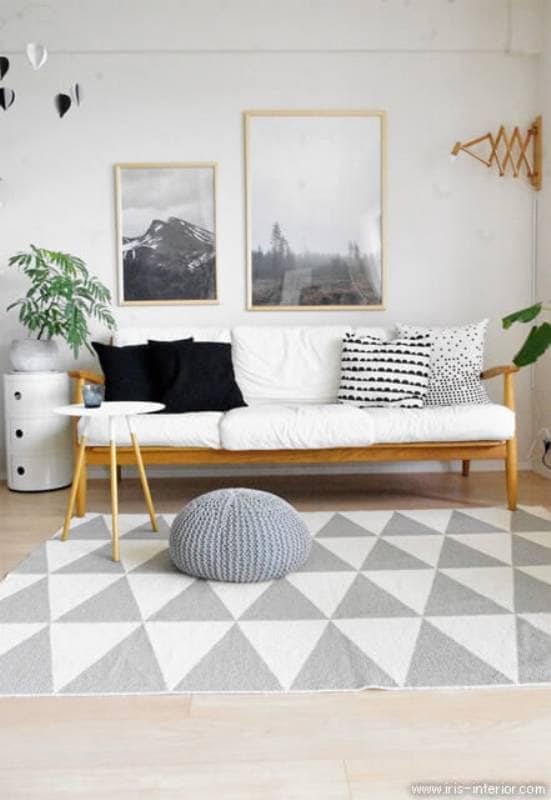 春夏のリビングは、白いコットンリネンのソファーカバーとプラスチックラグ。薄い色ばかりだとぼんやりした印象になるので、黒いクッションも置いて引き締めました。
