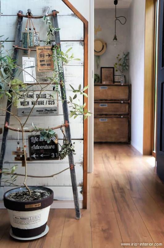 玄関は木製の下駄箱+ディスプレイでカフェ気分♪