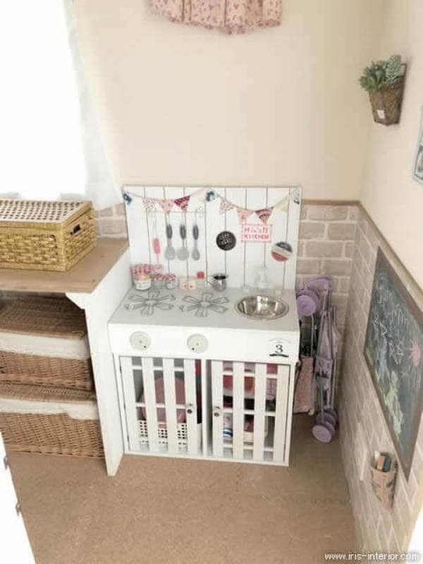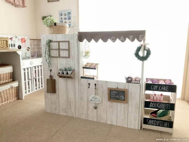 私は、子どもが喜ぶインテリアが好き。おもちゃ収納兼、おままごとセットなどもカラーボックスをアレンジして作りました。100均グッズやベニヤ板やすのこなどをいろいろと組み合わせています。