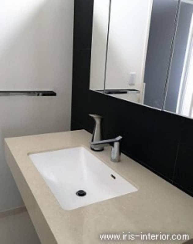 家を建てるときに一番悩んだのは洗面台かもしれません。サンワカンパニーの人造大理石のもので、夫の希望もあり、フロートタイプで洗面台の下に収納棚などは一切無し。重厚感があるし、極力シンプルで掃除もしやすいのでとても気に入っています。