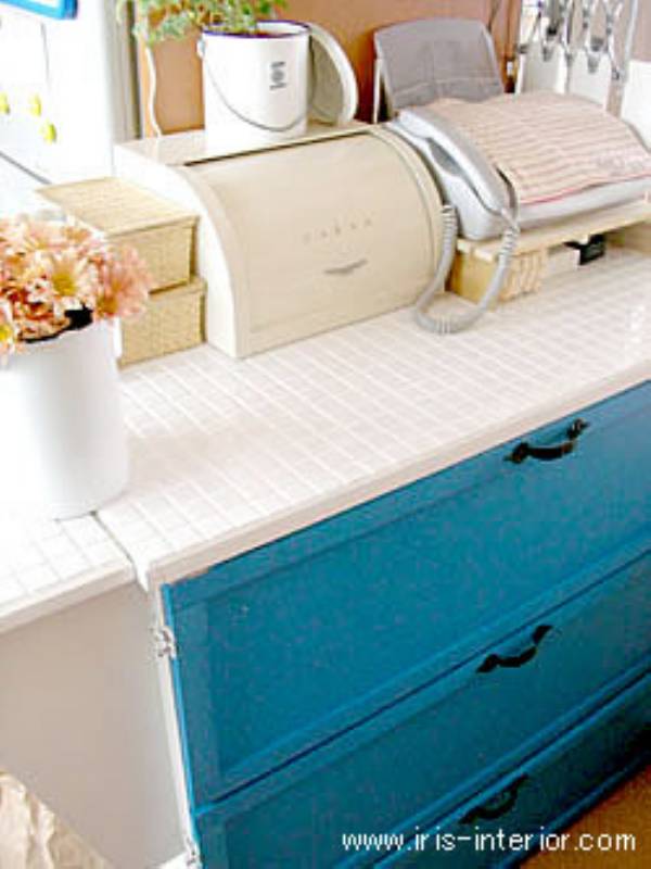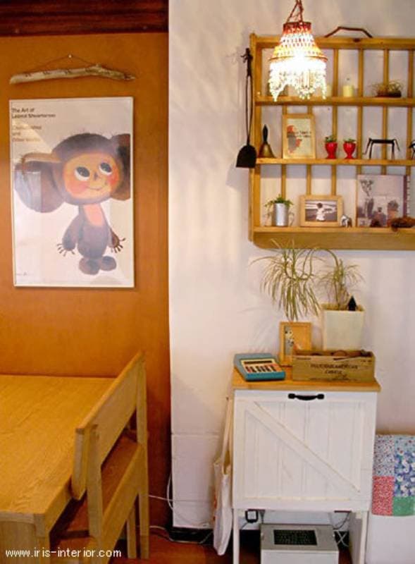 いつも次は何を作ろうかと考えている、というichikoさん。キッチンカウンターはモザイクタイルを貼り、きれいなブルーに塗り替えてリフォームしたもの。リビングの壁に掛けてある飾り棚ももちろん手作りです。お家中に手作り家具がいっぱいですよ。